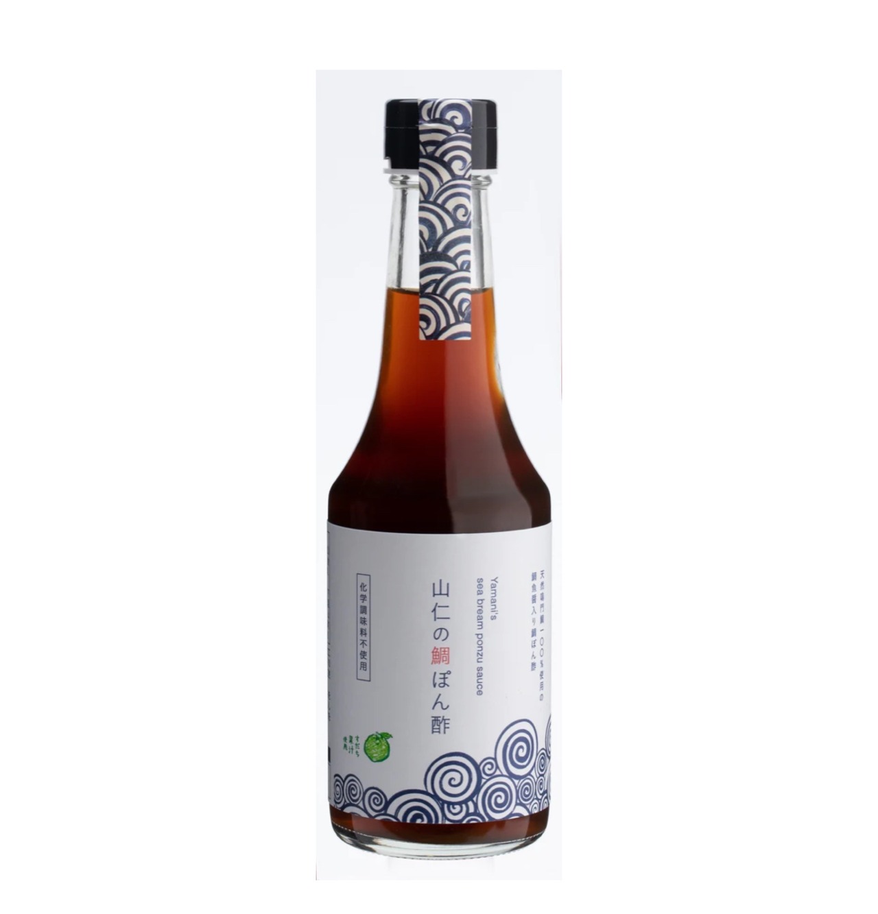世界三大潮流の一つ鳴門海峡の激流にもまれ育ち、身の引き締まった天然鳴門鯛は自社 山仁産業(有)の定置網漁で水揚げされたものを使用し、じっくりと発酵させ、旨味を凝縮させた鯛魚醤に、徳島県産のすだち果汁を混ぜ合わせて、仕上げた鯛ぽん酢です。