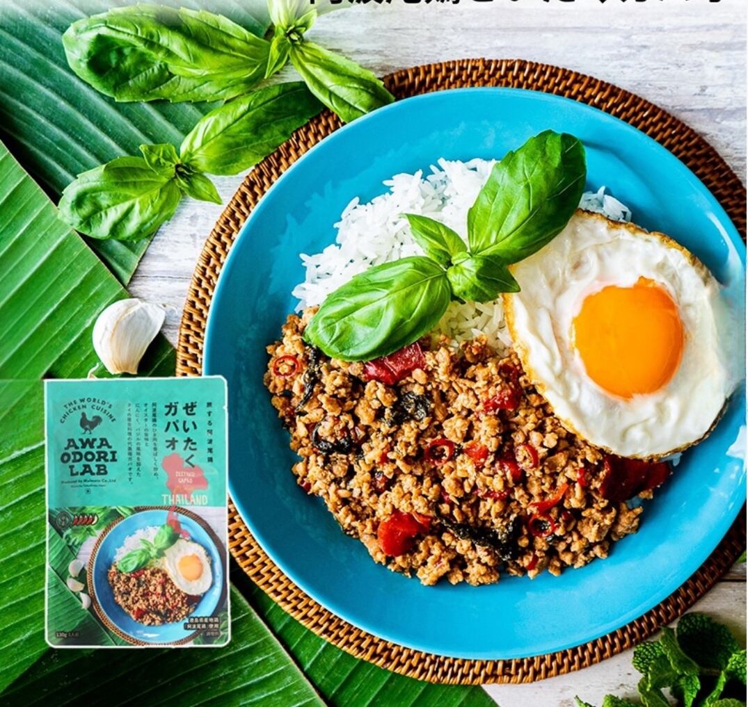徳島県産地鶏・阿波尾鶏のひき肉を香ばしく炒め、オイスターの旨味とにんにく、バジルの風味を加えたタイ料理の代表格・ガパオライスの素です。