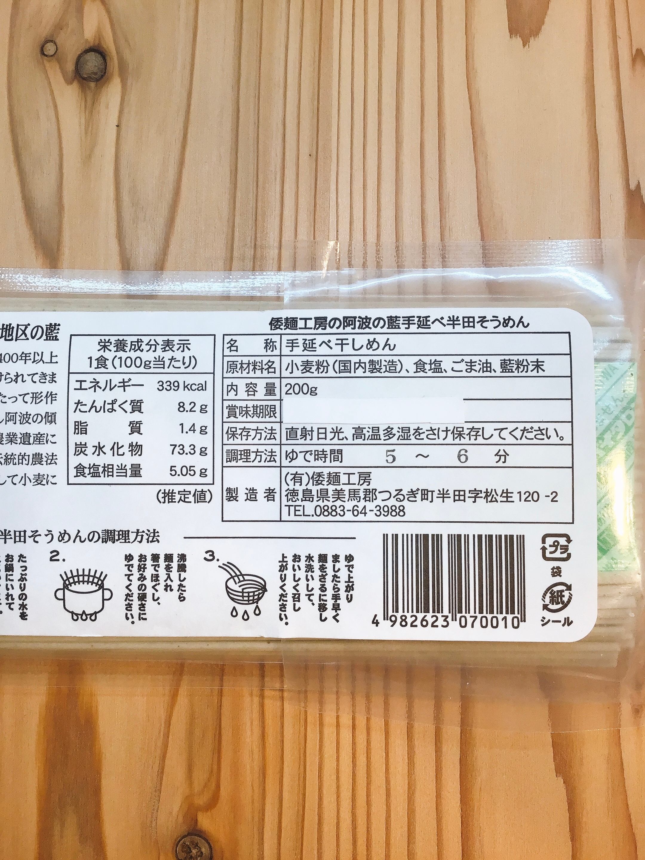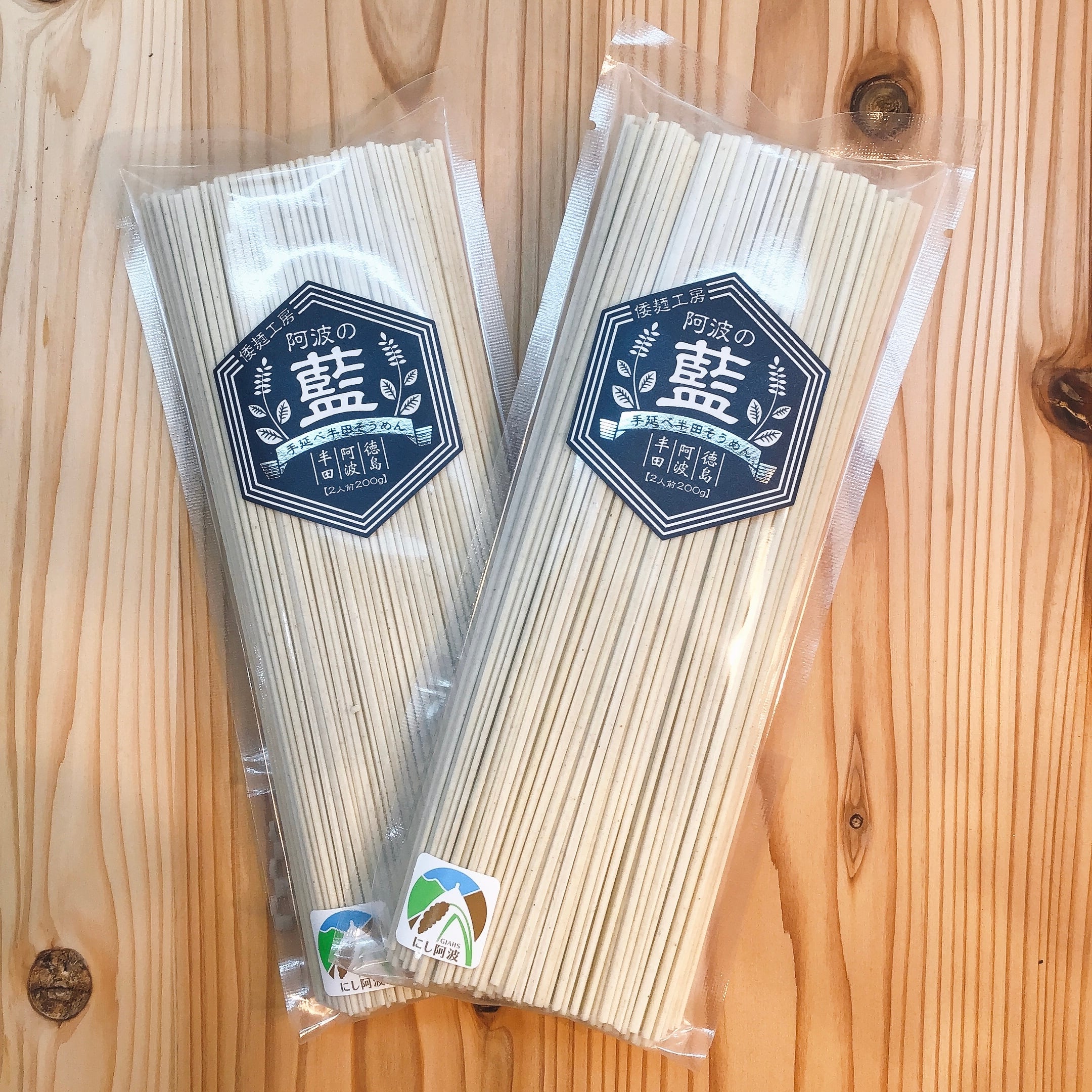 世界農業遺産に登録された、傾斜地農法 無農薬手作業で栽培した藍の葉の粉末を半田手延べ素麺に練りこみました。